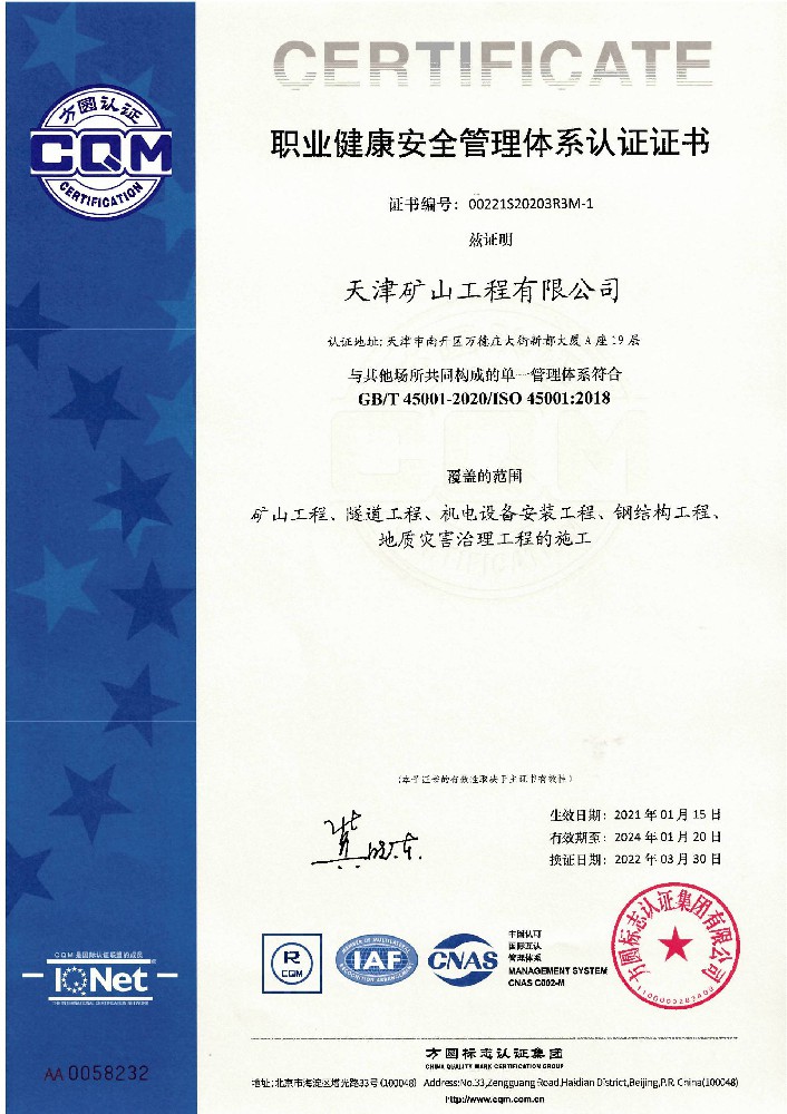 職業健康安全管理體系認證證書